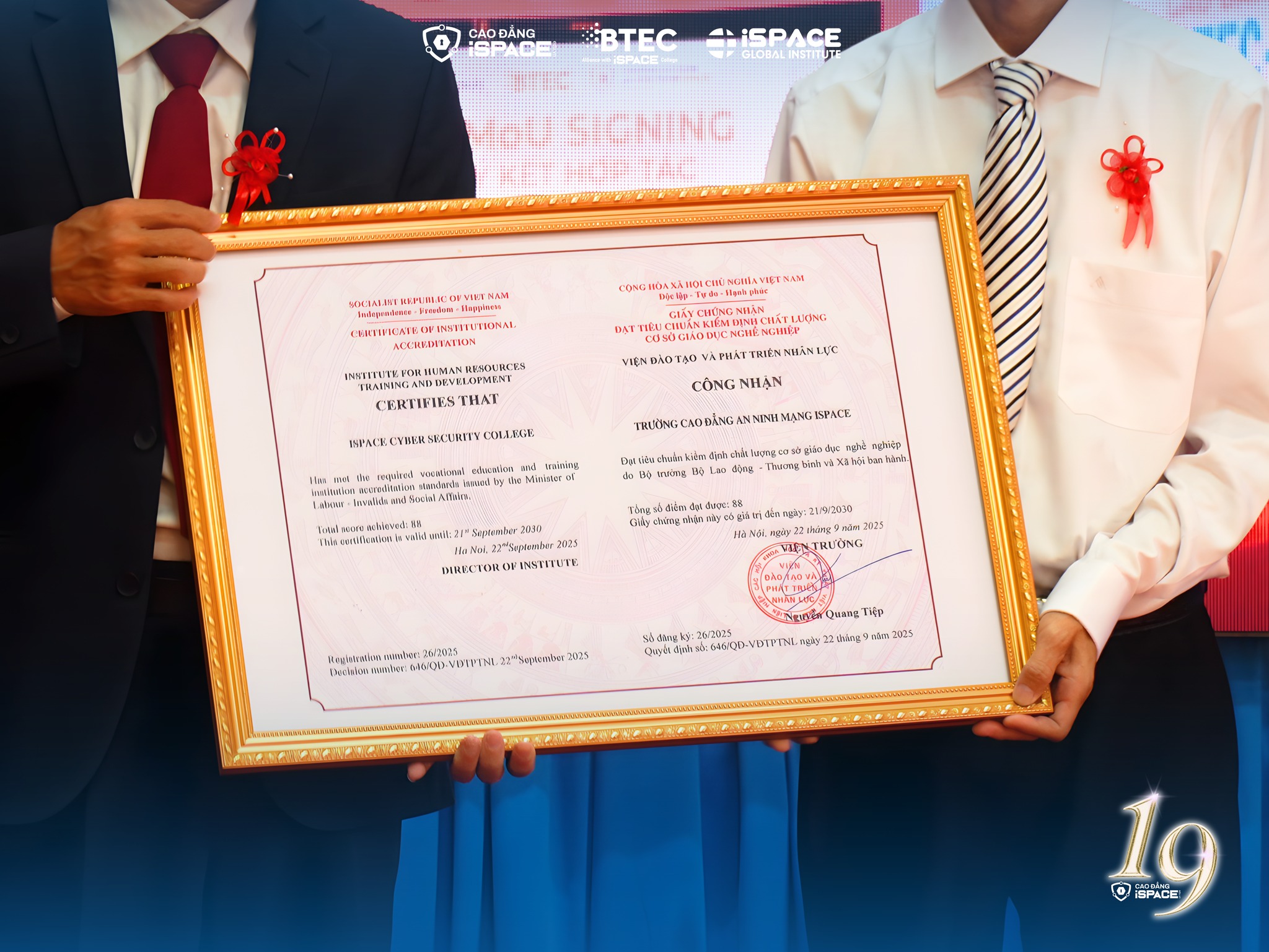 Ngay tại buổi lễ, Trường Cao đẳng An ninh mạng iSPACE đã chính thức nhận chứng nhận đạt chuẩn Kiểm định chất lượng giáo dục nghề nghiệp, chứng nhận đã góp phần khẳng định, giữ vững uy tín và chuẩn đào tạo theo tiêu chí quốc gia. Bên cạnh đó, nhà trường cũng ra mắt nhiều trung tâm mới tại các tỉnh thành An Giang, Tây Ninh, Lâm Đồng, Đà Nẵng và Vĩnh Long, mở rộng hệ sinh thái học tập, thực hành và nghiên cứu cho sinh viên.